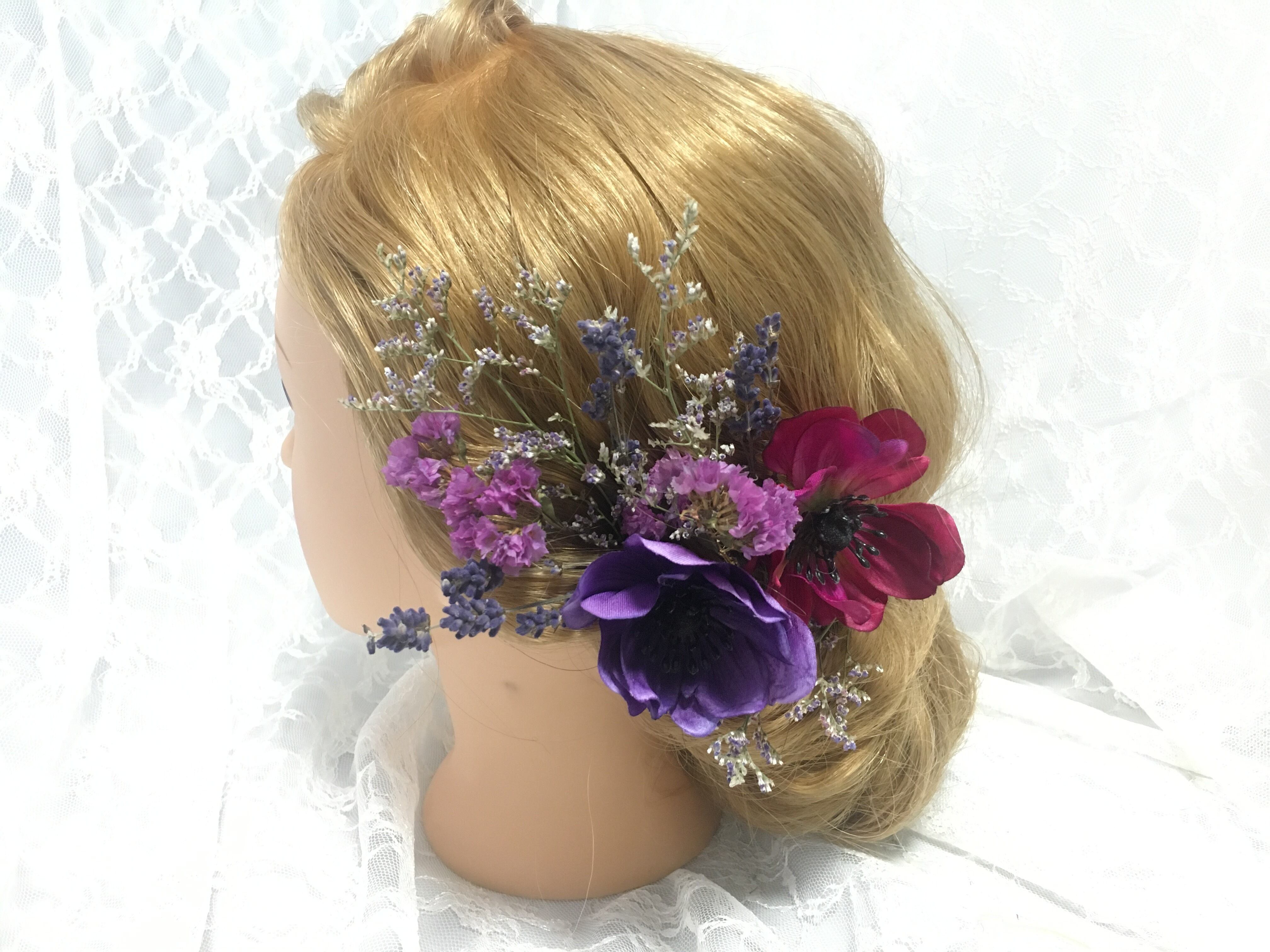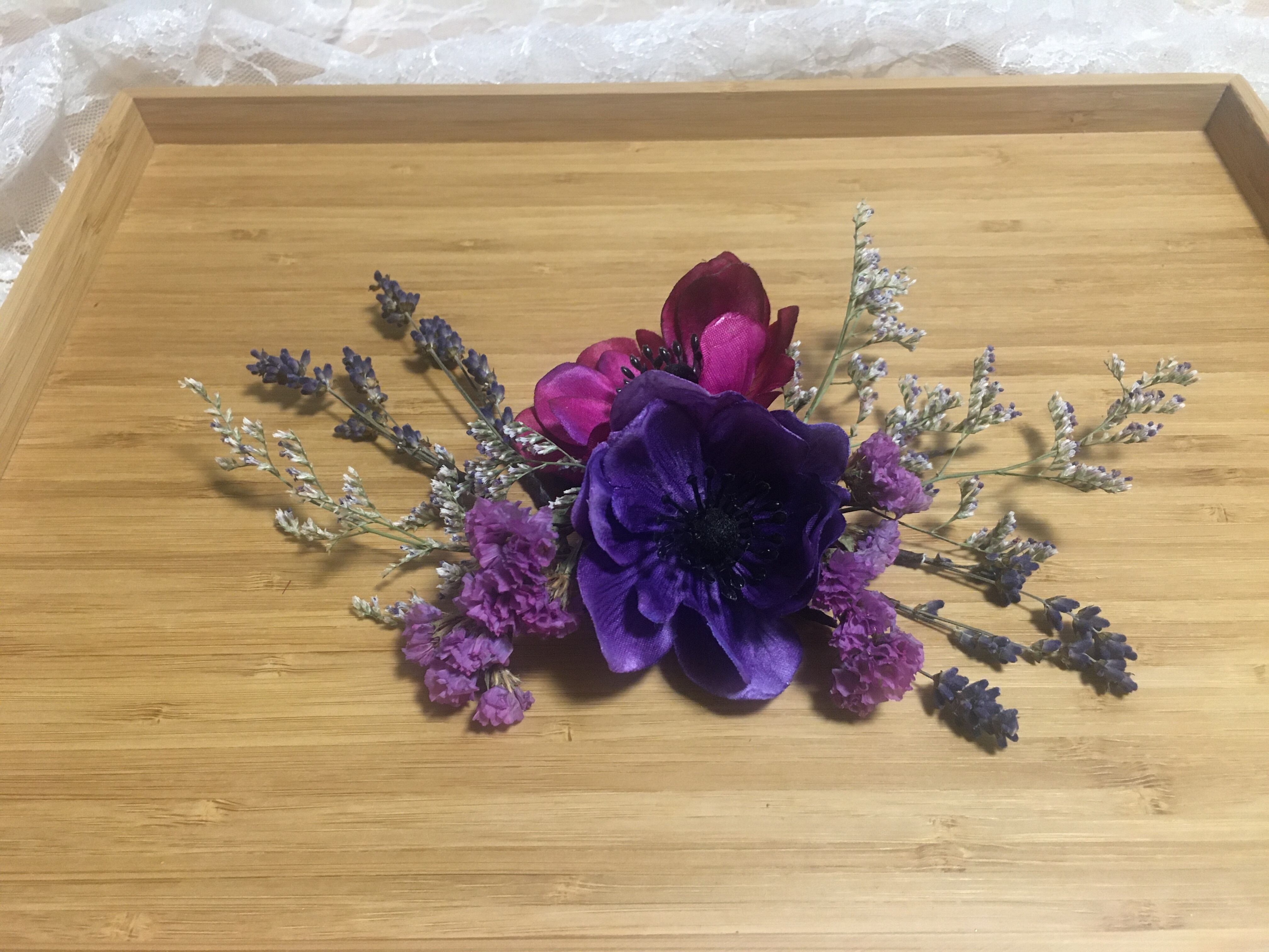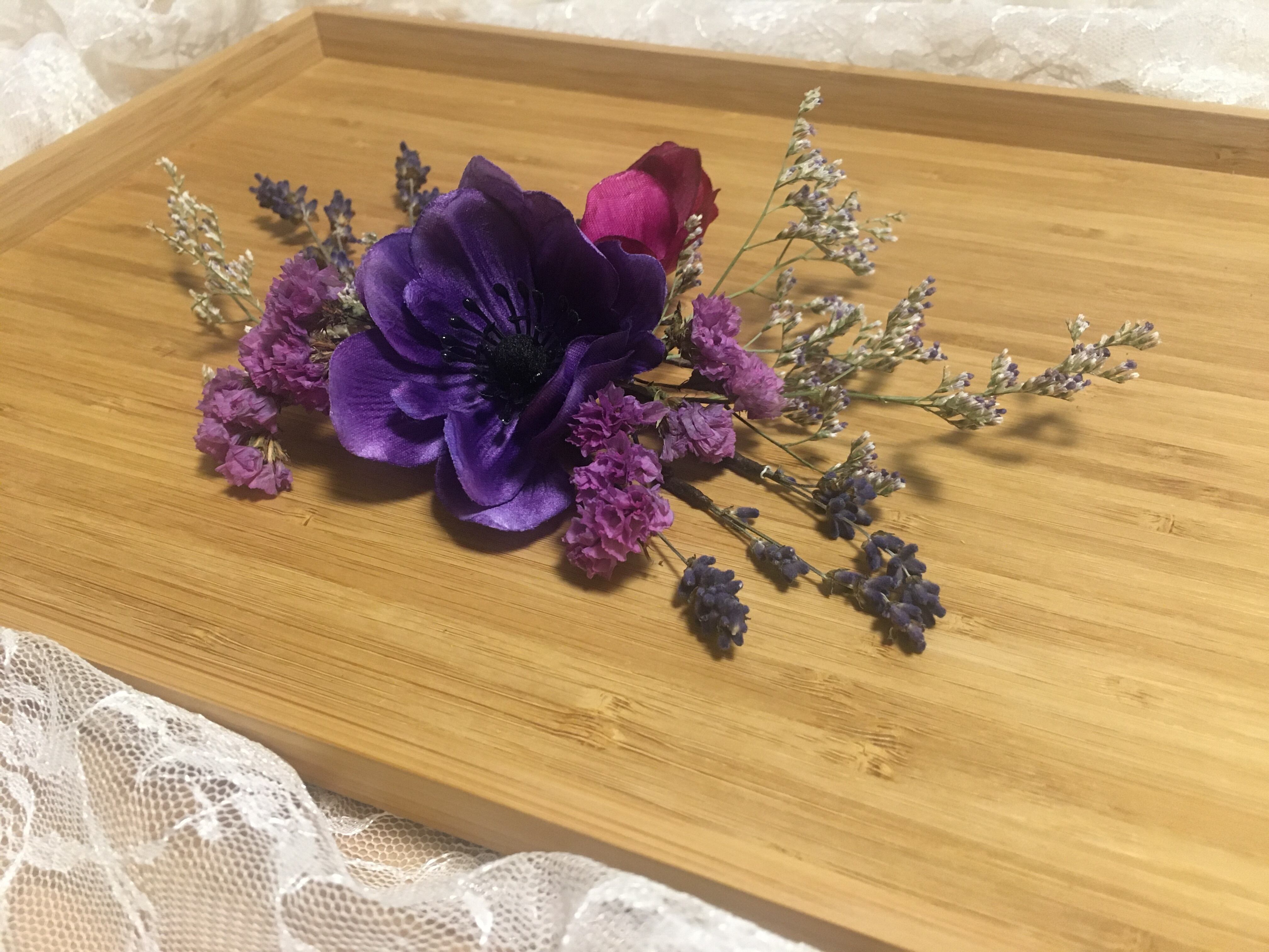 *人気のアネモネのお花をメインにブルーファンダジアのお花でアレンジした明るく存在感のある豪華な髪飾り。 結婚式、披露宴、二次会などドレスコードにぴったり似合う髪飾りです。 ♡お花は一輪ずつ独立してUピン、又はワイヤーに取り付けてあります。 ♡自由にお好きな位置に付けられるので様々なヘアスタイルを楽しむことができます☆ ♡アネモネのお花にはアーティフィシャルフラワーを使用。