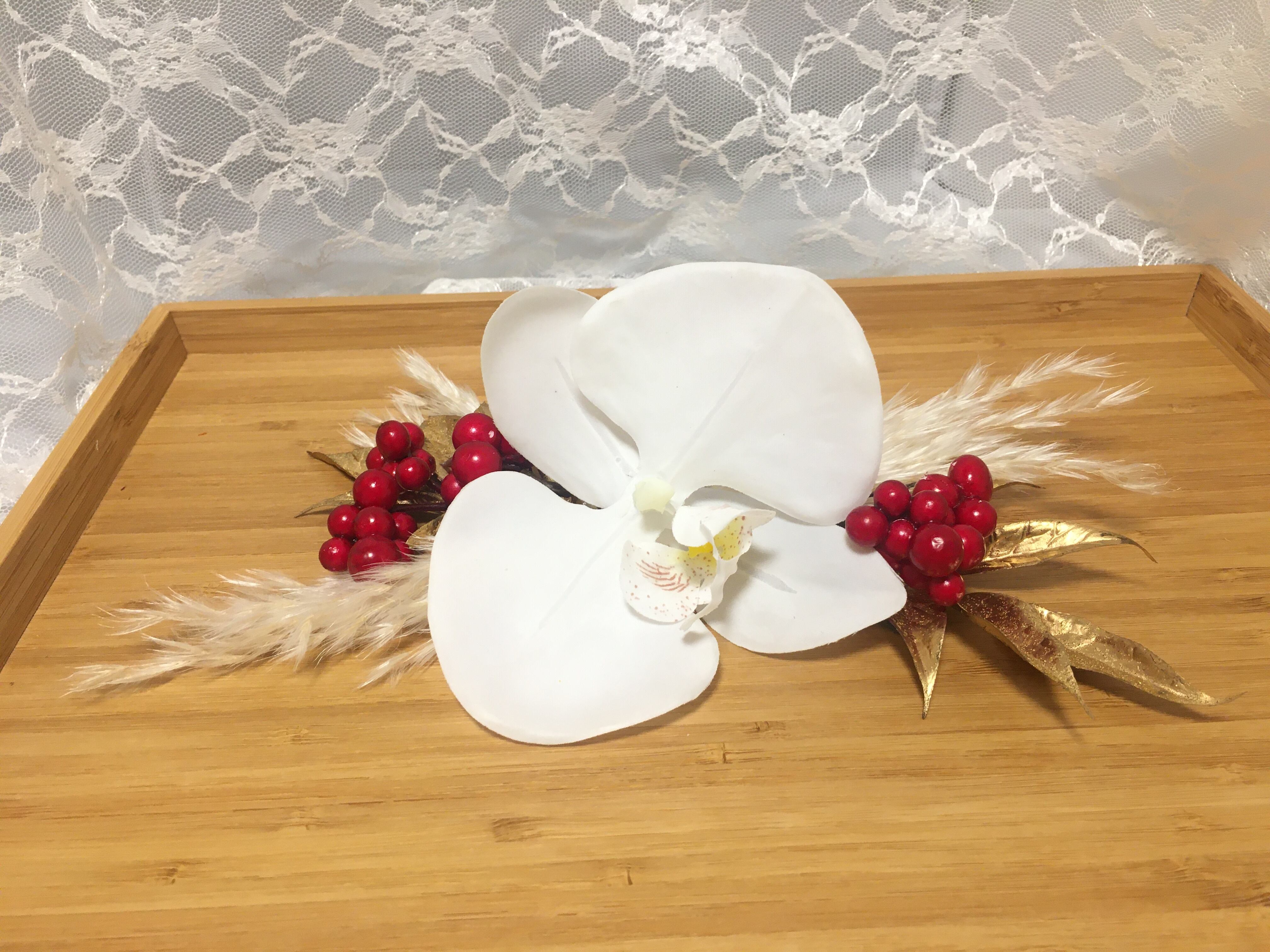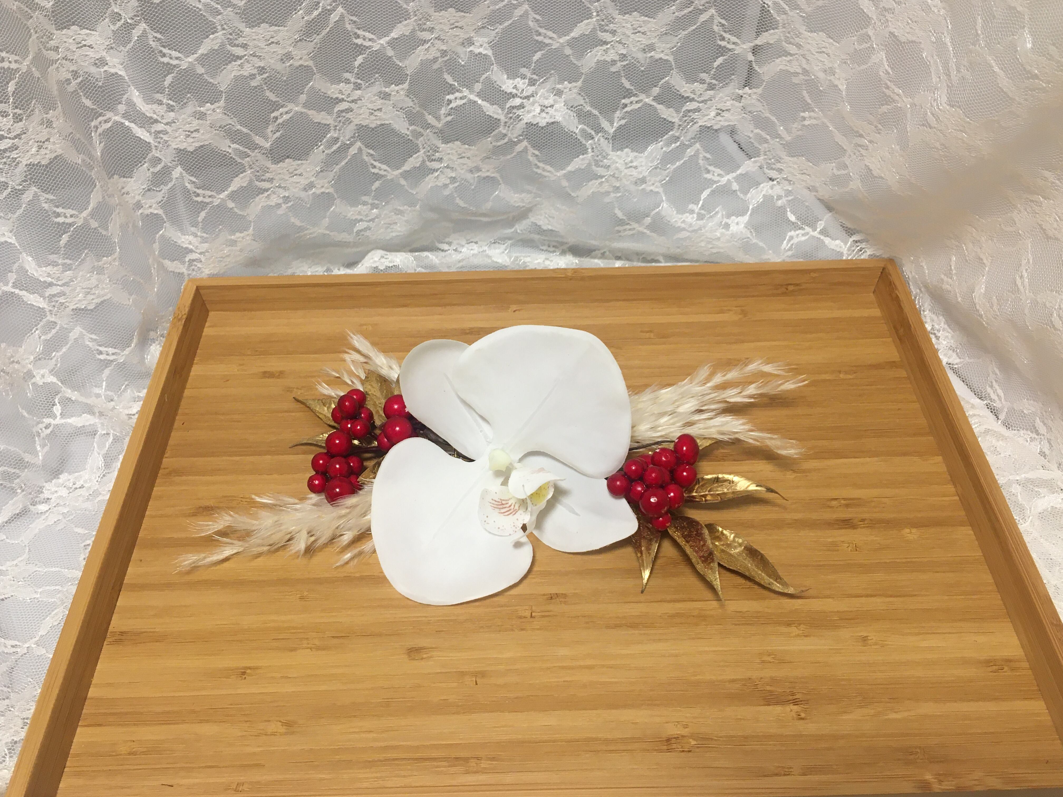 ※金の葉はお写真と異なりますが似たものでご用意です *人気の胡蝶蘭のお花をメインにパンパスグラスのお花でアレンジした明るく存在感のある豪華な髪飾り 胡蝶蘭が上品な印象を与えてくれます☺︎ ♡お花は一輪ずつ独立してUピン、又はワイヤーに取り付けてあります。 ♡自由にお好きな位置に付けられるので様々なヘアスタイルを楽しむことができます☆